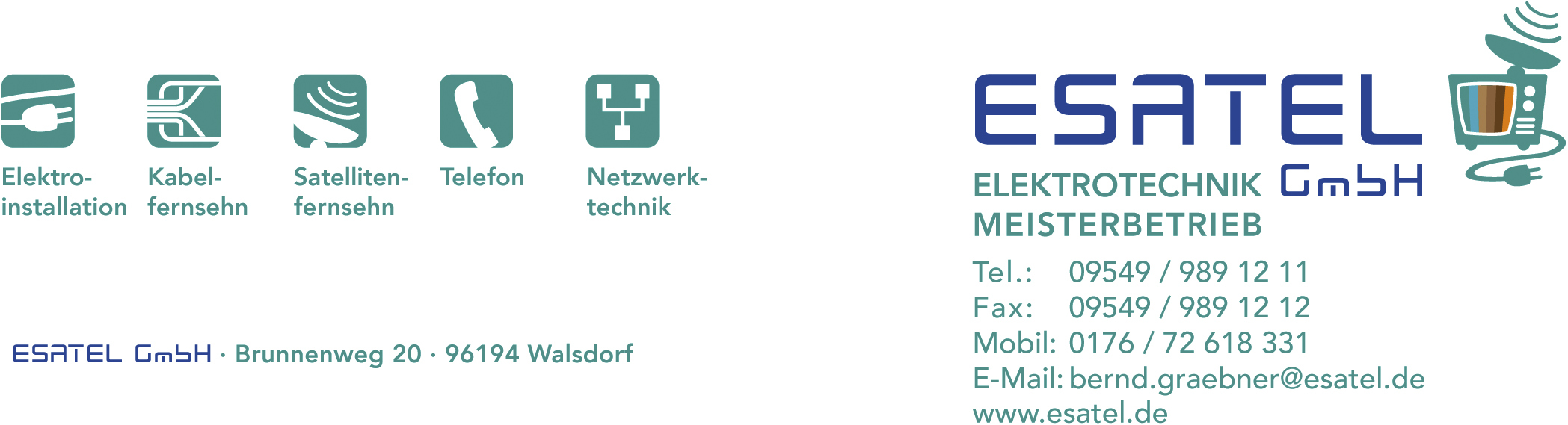 ESATEL GmbH Bernd Gräbner Brunnenweg 20 96194 Walsdorf Kontakt: Telefon: +49 176/72618331 +49 176/72618331 Telefax: E-Mail: info@esatel.de